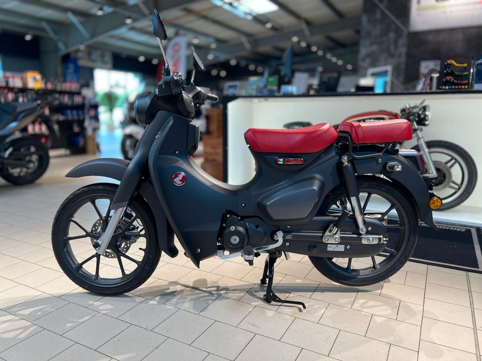 Seit über 60 Jahren dient die Super Cub Millionen von Menschen auf der ganzen Welt als einfaches und robustes Transportmittel. Der Roller hat sich modischen Trends nie unterworfen, sondern setzt seit Jahrzehnten Maßstäbe hinsichtlich Benutzerfreundlichkeit, Wirtschaftlichkeit und Langlebigkeit. Der Roller im Retro-Stil ist durch und durch authentisch, überzeugt mit modernen Details – und ist heute so nützlich wie nie zuvor. Der brandneue luftgekühlte Motor bietet mehr Leistung und verbraucht weniger Kraftstoff. Darüber hinaus besticht die Super Cub durch ein überarbeitetes, komfortables Fahrwerk.Tageszulassung