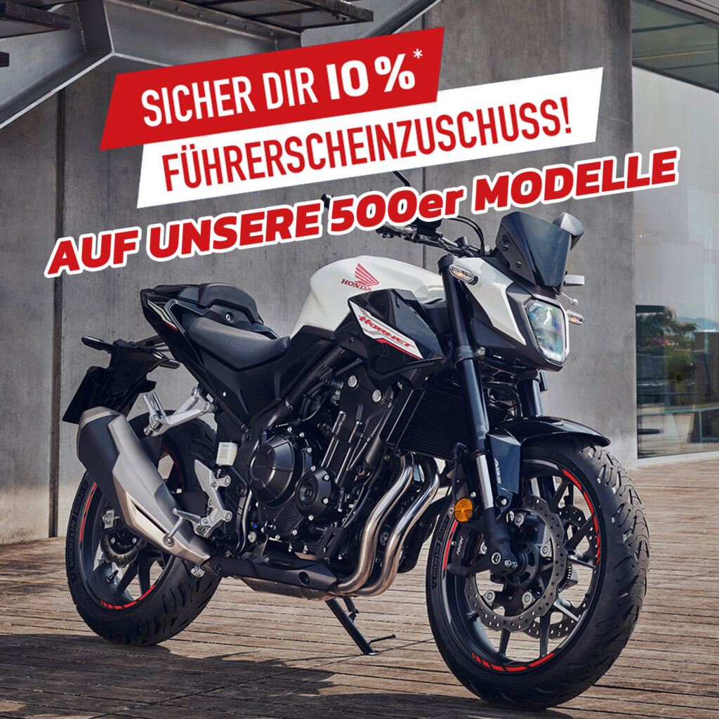 Führerscheinzuschuss: 10 % bzw. max. 824,90 € Nachlass auf die UVP (inkl. Überführungsgebühr) von Honda Deutschland beim Kauf ausgewählter Honda Modelle: CBR500R, CB500 Hornet, CL500, CMX500 Rebel, CMX500 Rebel Special Edition und NX500. Gültig sowohl für Direkteinsteiger als auch für Aufsteiger, die nur noch eine praktische Prüfung ablegen müssen, sowie für absolvierte Prüfungen aus dem Jahr 2024/2025. Nicht mit anderen Aktionen kombinierbar.